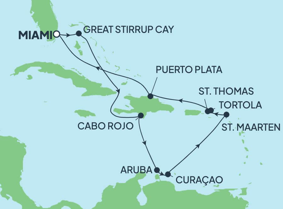 Descubre la vibrante belleza del Caribe en unas vacaciones de 12 días bajo el sol. Bebe un trago helado y relájate en tu cabaña privada en la playa en Great Stirrup Cay, nuestro paraíso tropical justo para ti. En Oranjestad, Aruba, disfruta del encanto europeo-caribeño a lo largo de vibrantes avenidas o encuentra la calma en las grutas solitarias. Pasea por las coloridas calles de Willemstad, Curazao, admirando la arquitectura de inspiración holandesa y los concurridos mercados llenos de tesoros locales.