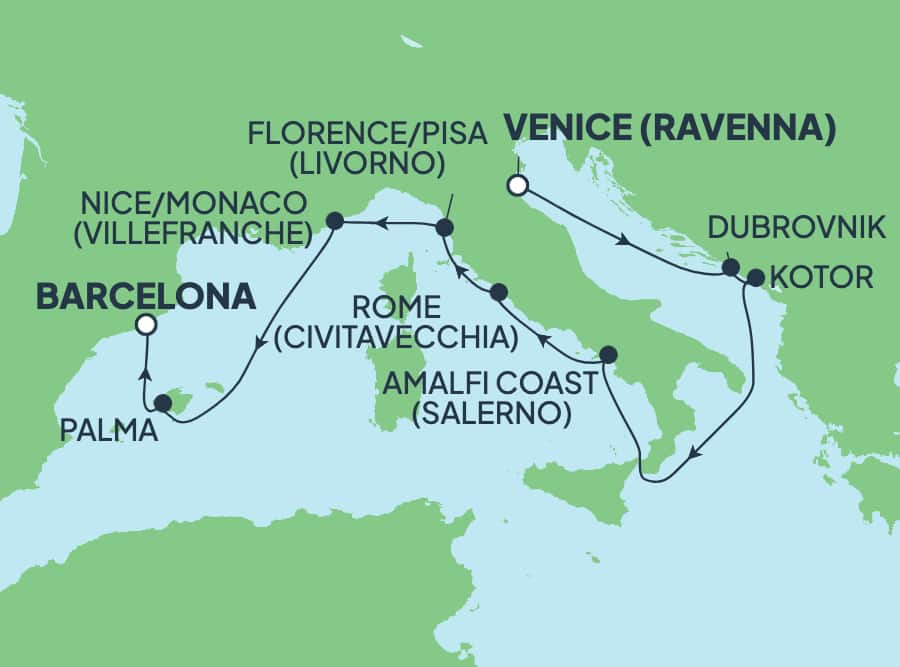 Disfruta al máximo tus vacaciones de verano en Europa a bordo del Norwegian Viva®. Los fanáticos de la serie Game of Thrones podrán disfrutar de un tour por la Vieja Ciudad de Dubrovnik, donde se ubican varios de los lugares históricos que aparecen en la exitosa serie de televisión. From Civitavecchia, explore Rome's famous ancient ruins and works of art, from Michelangelo's awe-inspiring Sistine Chapel to the beautifully constructed Trevi Fountain. Palamós es la puerta de entrada a la región de la Costa Brava, famosa por sus espectaculares paisajes escarpados, pueblos pintorescos y deliciosa comida.