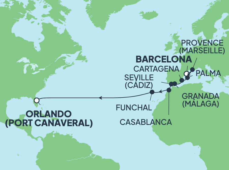 Súbete al Norwegian Escape® y disfruta de un increíble crucero transatlántico de 16 días desde Barcelona hasta Orlando con Norwegian. Pasea por las calles medievales de Barcelona en el Barrio Gótico, donde podrás apreciar la historia catalana en cada esquina y visita la icónica iglesia modernista de Gaudí, La Sagrada Familia. Vive toda la cultura de Sevilla, la capital de Andalucía, y visita su bellísima catedral, una de las más grandes del mundo. Luego, disfruta un tour de día completo a Cádiz con una visita al concurrido Mercado Central de Abastos, un mercado bajo techo que incluye más de 150 puestos de mariscos frescos y deliciosos platos de la cocina local.
