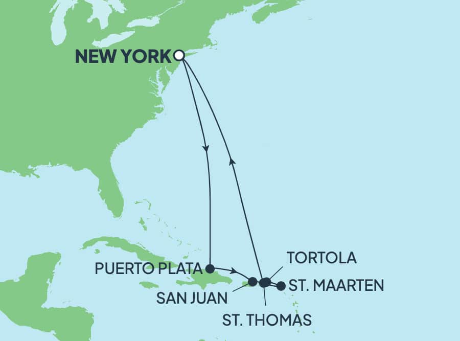 Te llevamos a recorrer las mejores islas del Caribe a bordo del Norwegian Breakaway​​​​​​​. Comienza tu viaje en la ciudad de Nueva York y visita Puerto Rico, Islas Vírgenes Británicas, Santo Tomás y mucho más. Pasea por las pintorescas calles de adoquines del Viejo San Juan y visita lugares históricos, o viaja por las exuberantes selvas tropicales y las magníficas playas del país. En Santo Tomás, relájate en un catamarán mientras navegas a Turtle Cove para hacer buceo de superficie entre peces tropicales de colores y tortugas marinas verdes.