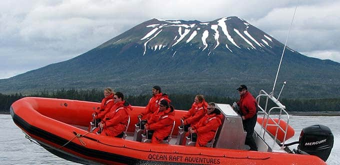 An Ocean Rafting Adventure is the perfect way to make your visit to Sitka an exciting and unforgettable one. You’ll begin by being equipped with state-of-the-art gear for this adventure. The gear includes a coast guard style exposure suit, balaclava, safety glasses and gloves. At up to 30 mph fun on the waves comes with a blast of fresh air in the open seating of raft. Specially designed straddle seats provide comfortable and secure seating for this exciting trip out into nature. This thrill ride takes you offshore in ocean waters where you'll fly over the ocean swells while watching seabirds glide past. Watch for whales and sea otters on your way to explore the ravaged volcanic coastline of Kruzof Island. While exploring this coastline you’ll get up close to towering cliffs, where sea birds’ nest and go right into volcanic sea caves (weather permitting). At opportune times the captain stops the boat and shuts down the engine so you can listen to the surf crashing off of volcanic cliffs and the songs of nesting seabirds or for whales breathing. Welcome to a world filled with the sights, sounds and smells of the ocean. This is an intimate glimpse of Alaska’s wild splendor that will excite your senses and leave you with lasting memories.